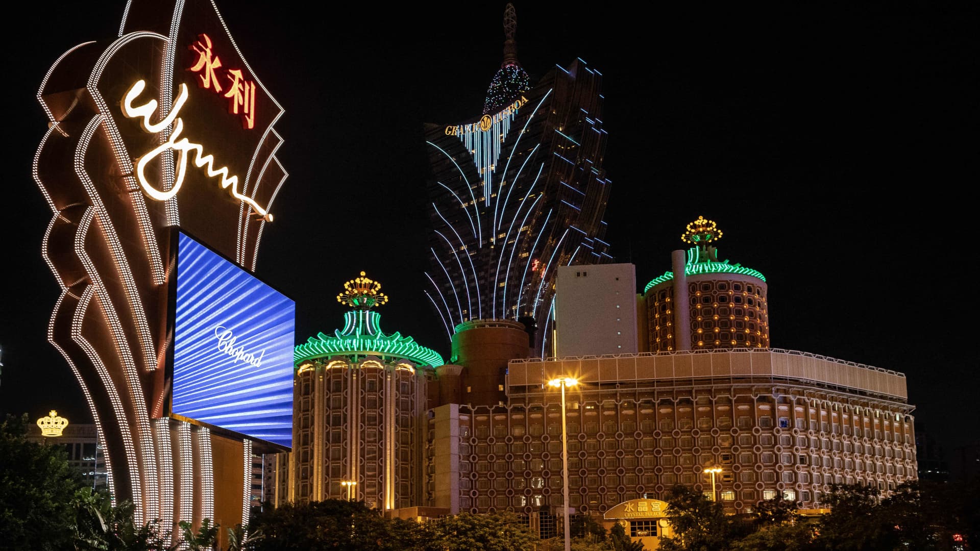 This {photograph} taken on October 20, 2022 exhibits the signage of Wynn On line casino resort with the Grand Lisboa and On line casino Lisboa within the backdrop in Macau.