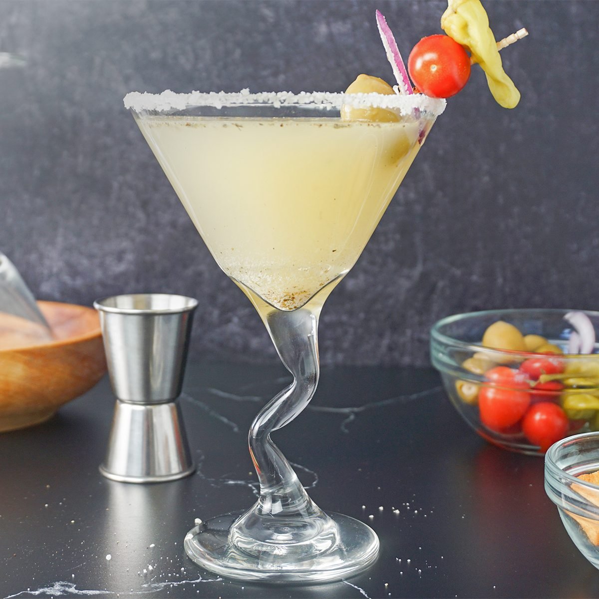 Components for the Olive Backyard Salad Martini