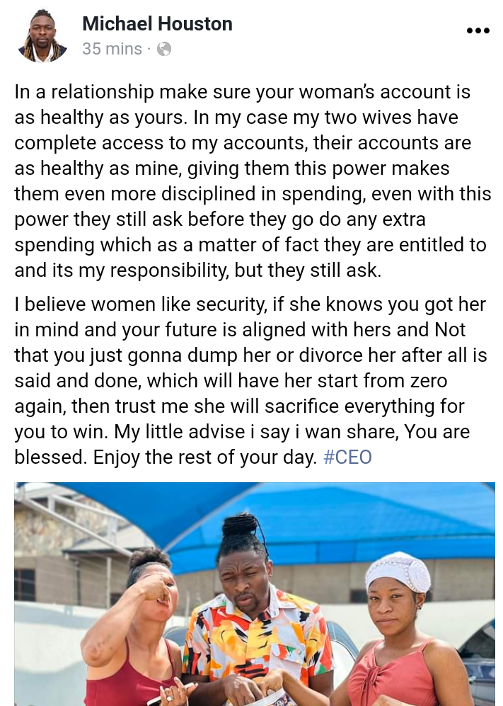 “In a relationship ensure that your lady’s account is as wholesome as yours. In my case my two wives have full entry to my accounts, their accounts are as wholesome as mine, giving them this energy makes them much more disciplined in spending, even with this energy they nonetheless ask earlier than they go do any additional spending which as a matter of truth they’re entitled to and its my accountability, however they nonetheless ask,” he wrote.