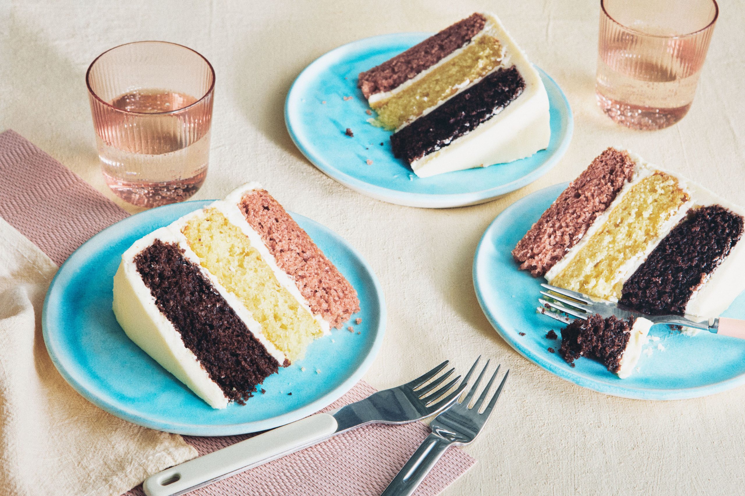 Impressed by Wayne Thiebaud’s iconic 1979 portray Cake Slice, this tricolor magnificence is a assured showstopper for any birthday or celebration. Manufactured from three distinct cake layers, one tinted with freeze-dried strawberries, one with cocoa powder, and one left plain, the layers create a kaleidoscope of flavors paying homage to Neapolitan ice cream. Whereas this would possibly sound like a undertaking, the method is surprisingly easy: You make only one cake batter, divide it amongst three bowls, and add flavorings and elective meals coloring to reinforce every one. That’s it. There’s no have to whip up three completely different cake recipes, and all of it will get blended along with a whisk. A fast frosting made with butter, bitter cream, and powdered sugar enrobes the colourful layers, masking the multicolored shock inside.