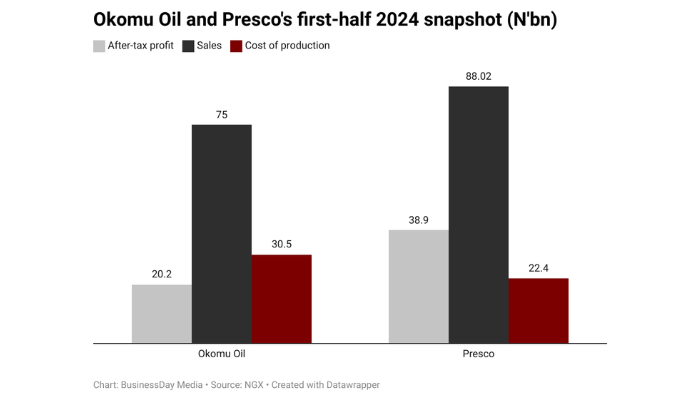 Okomu Oil’s finance value elevated to N7.44 billion within the first half of 2024 from N1.21 billion in the identical interval of 2023 whereas Presco’s finance value rose to N4.42 billion from N4.06 billion.