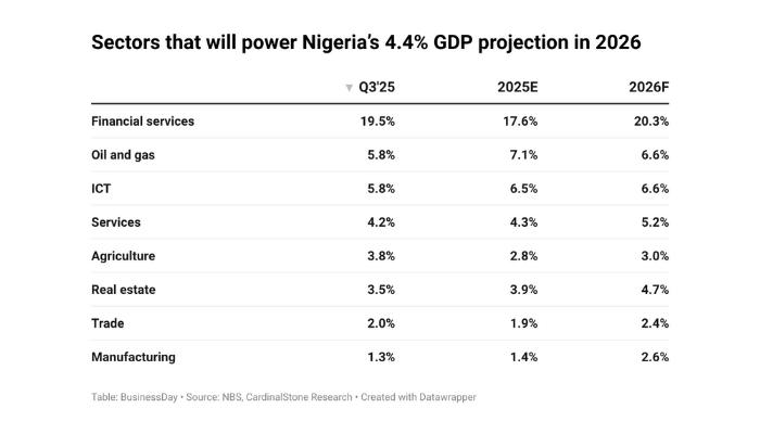 According to the 2026 Macroeconomic Outlook by CardinalStone Research, Nigeria’s real GDP is expected to rise to 4.4 percent in 2026, supported by a broad-based recovery across oil and gas, services, construction, agriculture, and the digital economy.