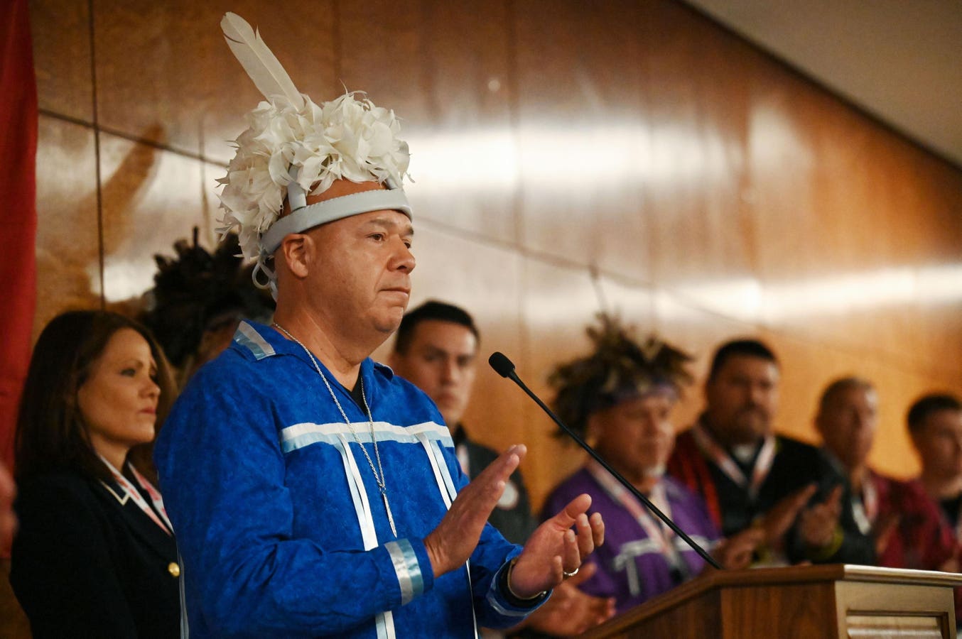 ALBANY, NY – MARCH 18: Seneca Nation of Indians President J. Conrad Seneca announces that Gov. Kathy Hochul will travel to the Seneca Nation to apologize on behalf of the state for historical abuses on Tuesday, March 18, 2025, during a news conference at Empire State Plaza in Albany, N.Y. (Will Waldron/Times Union)