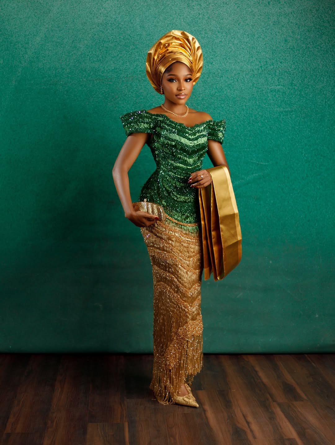 Speaking of sparkling game changers, this stunning green-golden dress by 7th Leo has us mesmerised! The green bodice melts into the golden skirt, and the whole ensemble glitters! The dress also features a structured off-shoulder neckline, shiny frills at the skirt hem and a voluminous green wavy drape! Everything about this look screams pure luxury! AY Gele added extra shine to the ensemble with this golden gele, pleated to perfection, while David’s Touch indeed brought their magical touch through this glowy, glamorous makeup. Imagine dancing into your traditional wedding, sparkling and looking absolutely gorgeous. We can guarantee that this ensemble right here can bring that dream to life! You can also find more beauty looks here.