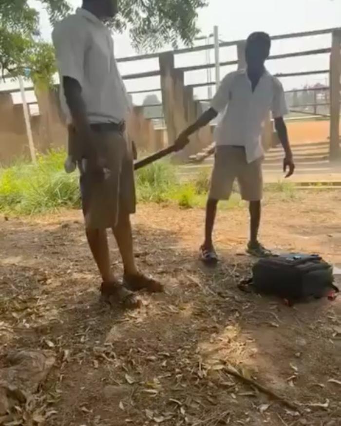 A video going viral on social media reveals a senior highschool scholar lashing his colleagues with a cutlass, sparking fury amongst netizens.