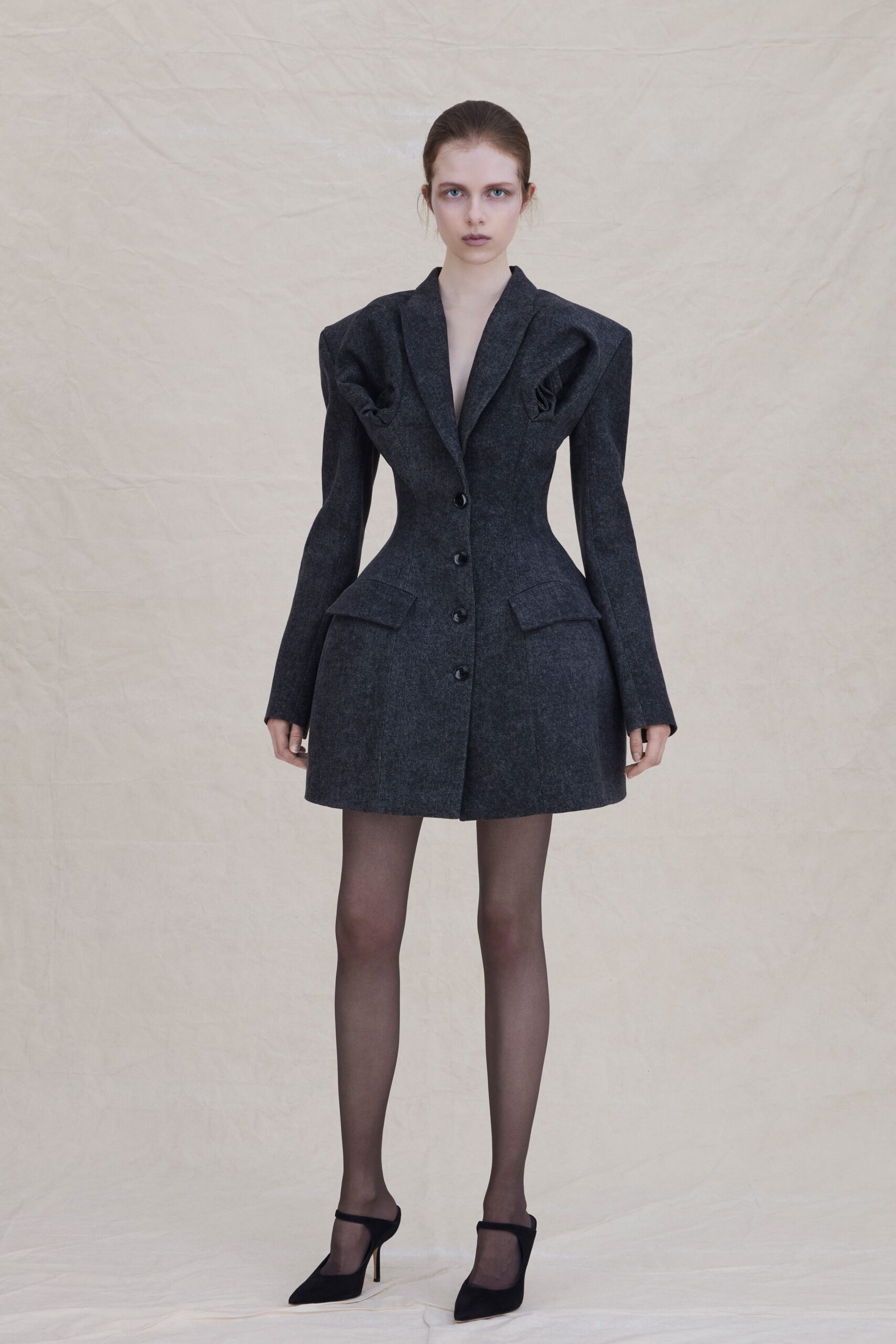 She achieved that look’s graceful shape, in denim worked on the reverse face, thanks to old-fashioned canvas and horsehair. But the idea returned in other materials, like boiled wool or shearling skirt suits. (“I love the idea of not needing a coat,” the designer offered.) A suit in black corduroy is paired here with a white funnel-neck shirt, a carryover from her first collection. A knitted, draped dress made from deadstock landed the minimalist trend with a twist in back: like the yellow mohair tartan dress that follows, it is spliced together. “I wanted to create pieces that had a sense of uncanny oddity, but at the same time elegance,” Dumi explained. Yes, a tartan skirt came with a petticoat—another carryover from her spring 2025 “Ship of Fools” collection—but she swears it packs light.