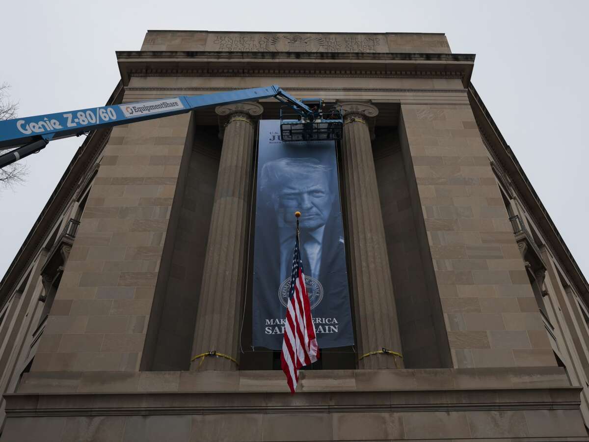 Last week, the Department of Justice (DOJ) hung a new banner outside its headquarters featuring President Donald Trump’s face, a startling move that critics say provides the starkest evidence yet that the department is not being run as independently, despite the administration’s claims.